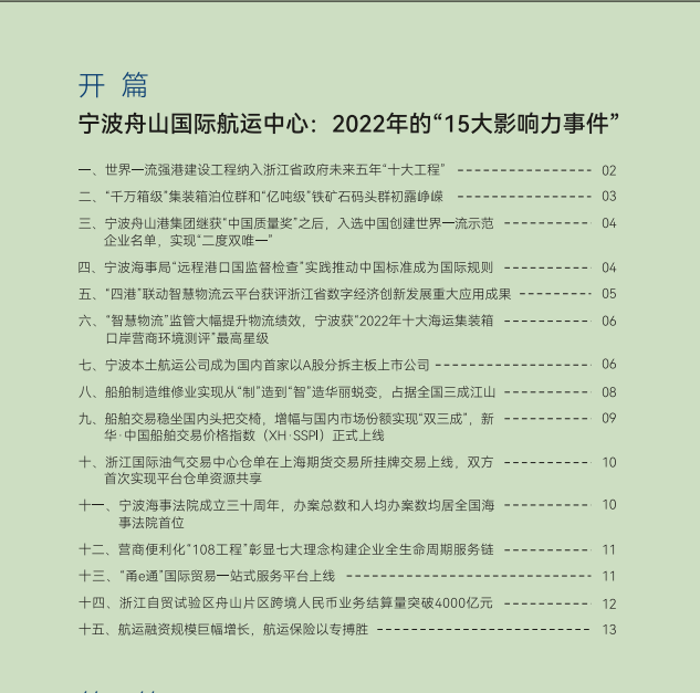 蓝皮书“开篇”中展示了2022年“世界一流强港建设工程纳入浙江省政府未来五年‘十大工程’”“‘千万箱级’装箱泊位群和‘亿吨级’铁矿石码头群初露峥嵘”“船舶交易稳坐国内头把交椅,新华·中国船舶交易价格指数(XH·SSPI)正式上线”“营商便利化‘108工程’彰显七大理念构建企业全生命周期服务链”等“15大影响力事件”。蓝皮书主体篇章包括“海港枢纽及疏运体系建设与发展”“航运服务功能体系建设与发展”“航运营商软环境建设与发展”等。