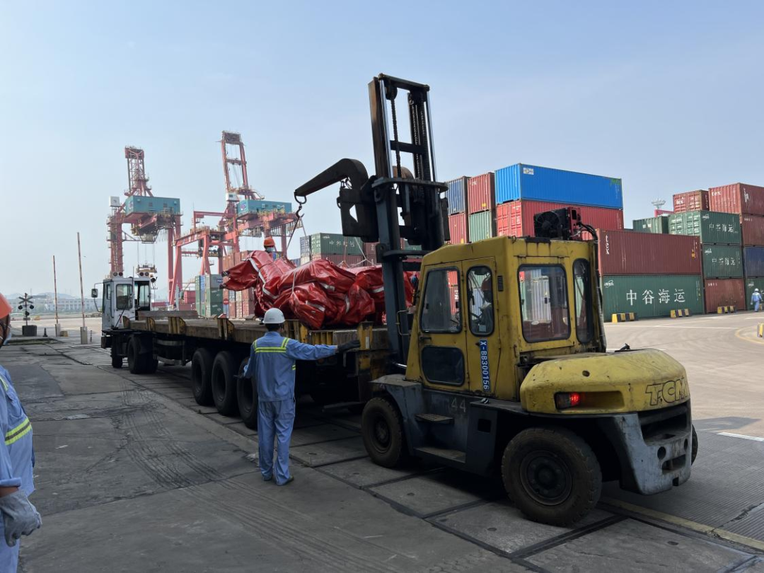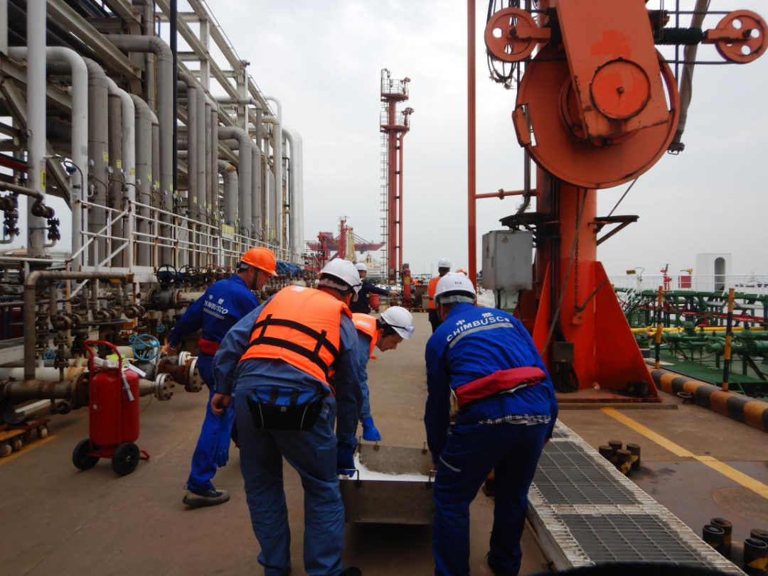联防体镇海片区应急仓库接到指令后,第一时间组织协调人员和机械进行应急物资出库,在公司10号泊位码头平台快速完成200米围油栏拼接,配合拖轮完成应急物资出运和围油栏下水任务。