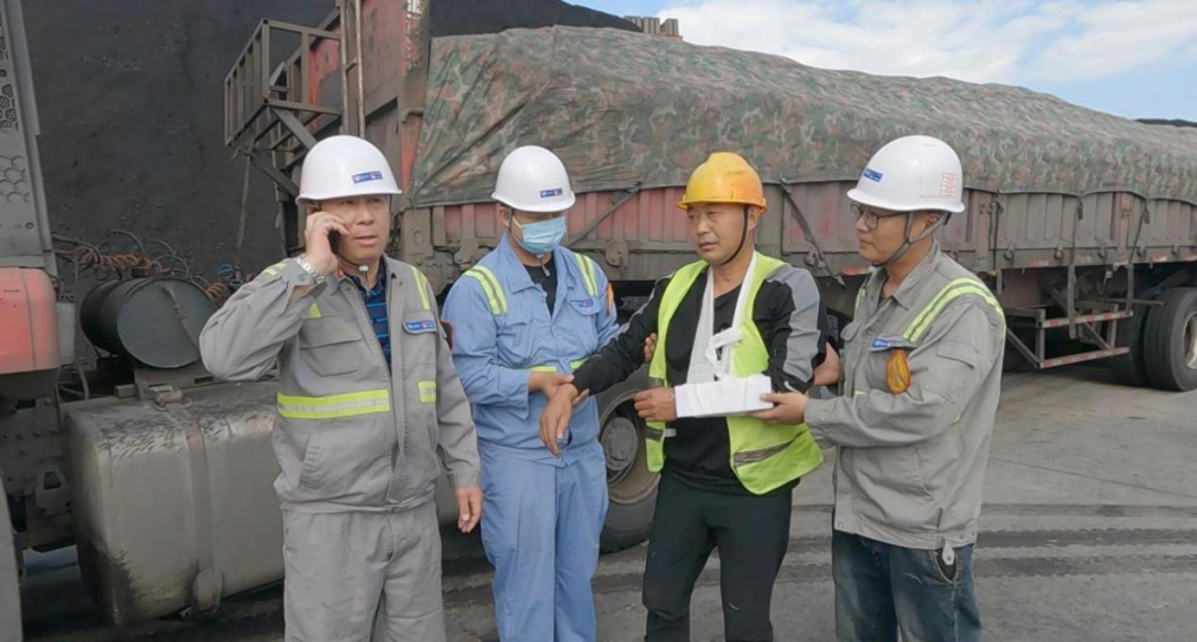 本次演练在煤炭堆场展开,模拟提货司机完成提货后,对车辆进行篷布覆盖过程中突然重心失稳,跌落地面导致手臂骨折。