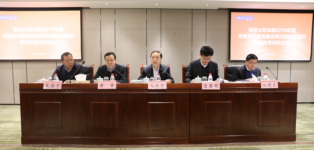 1月7日至9日,集团第一综合检查考评组对公司开展2018年度党建党风廉洁建设责任制执行情况等综合考评。7日上午,在综合检查考评动员会上,集团董事长、党委书记,股份公司董事长毛剑宏作动员讲话。考评组成员、公司领导班子成员、各部室负责人和机关全体人员参加会议。