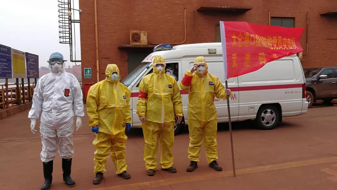 太仓武港紧急抽调党员成立党员突击队,穿戴好防护服、护目镜、口罩、乳胶手套等防护用品,投入工作。在党员突击队的指挥下,该公司一期装船码头停止所有装船作业,所有职工和流动机械全部有序疏散撤离。同时,该公司做好救援区域的消毒工作,并积极协助指引120救护车辆到达指定位置,让患病船员能够在第一时间得到救治。