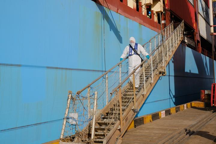3月20日16时20分,大港引航高级引航员杜伟杰与船长完成离轮手续交接后,从来自疫情重点地区的风险船舶“古娜马士基”轮上缓缓走了下来,这是该公司助力海关检验检疫人员排除了发热船员感染新冠肺炎的风险,为集装箱外轮的顺利靠泊提供了坚强保障的一处写照。