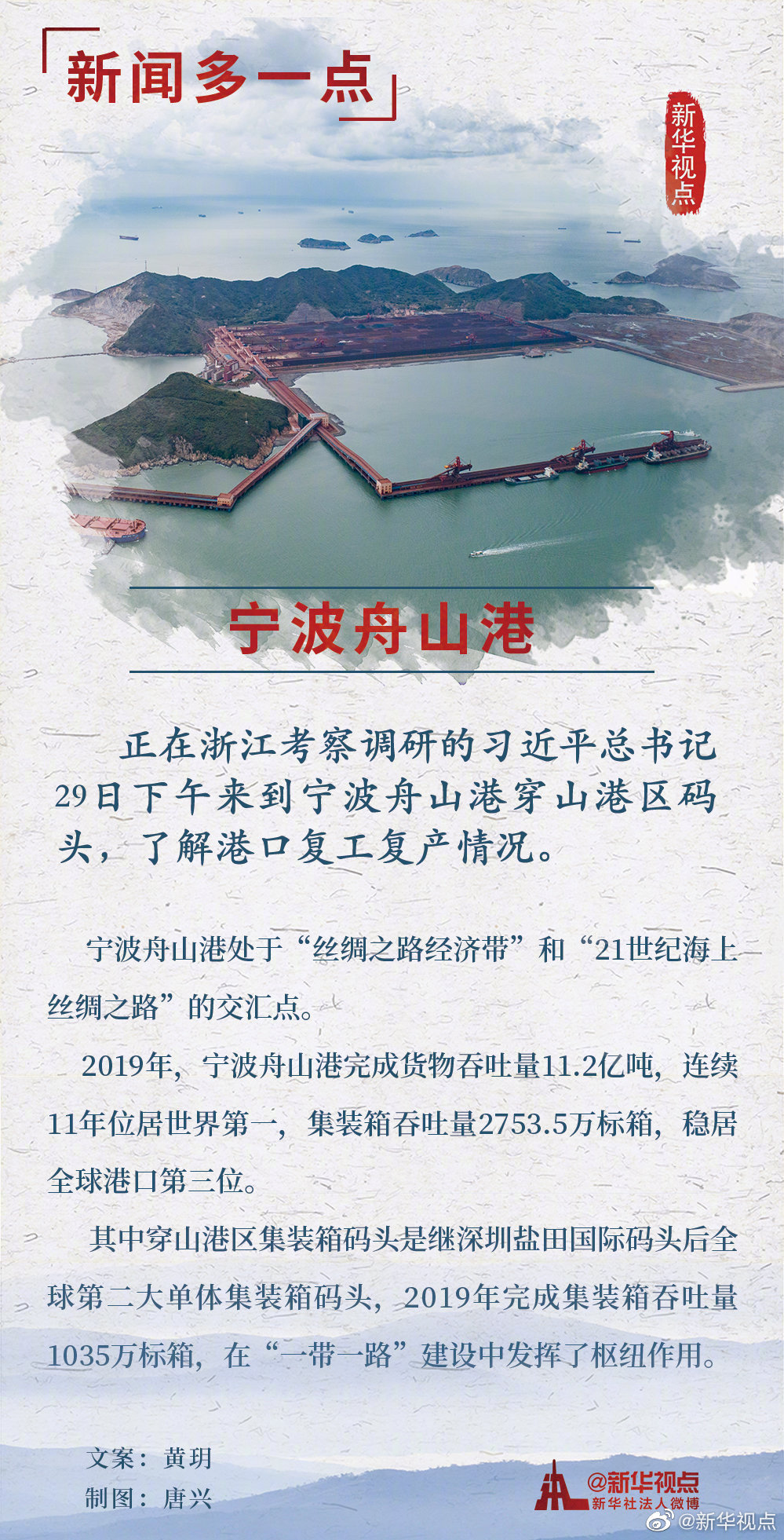 习近平总书记29日在浙江考察调研。当天下午,他先后来到宁波舟山港穿山港区码头、北仑大碶高端汽配模具园区,了解港口和园区企业复工复产情况。(记者:杨维汉、朱基钗)