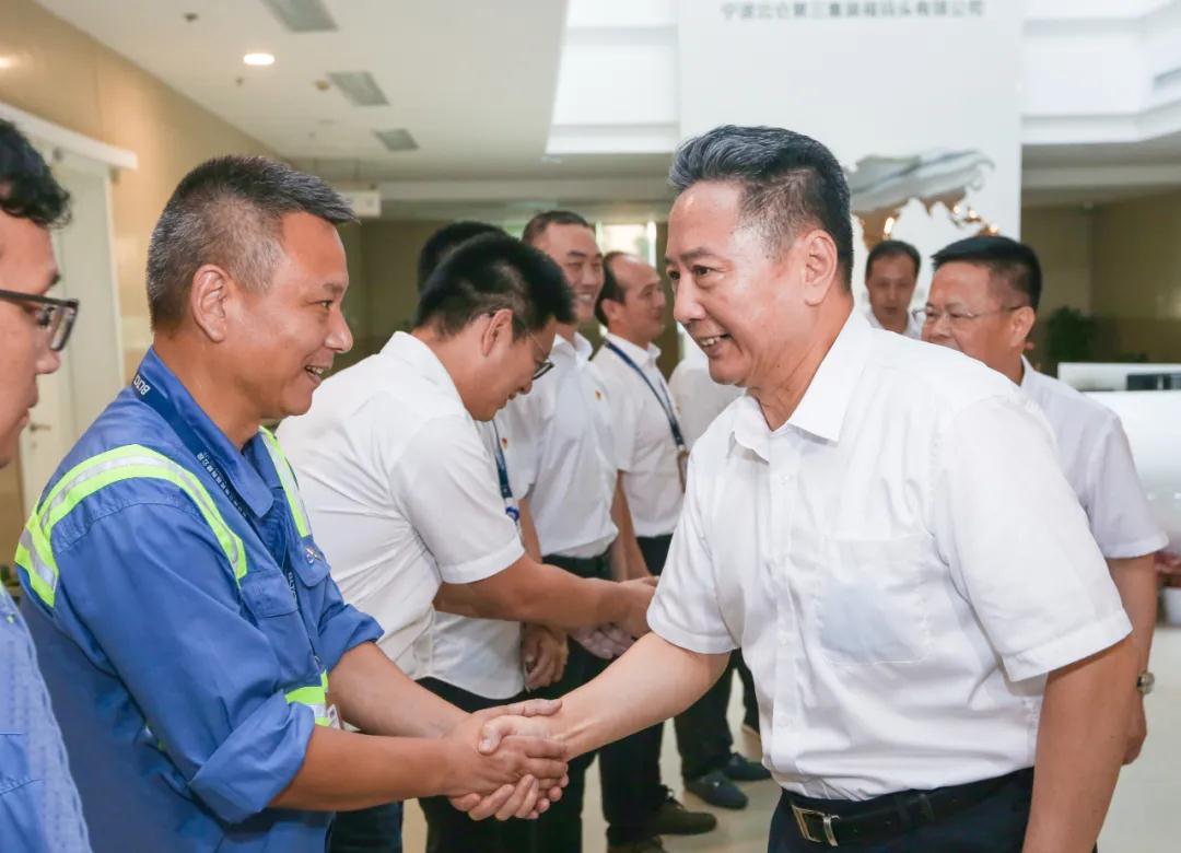 ▲图为李小鹏(右一)与宁波舟山港员工亲切握手时的场景
