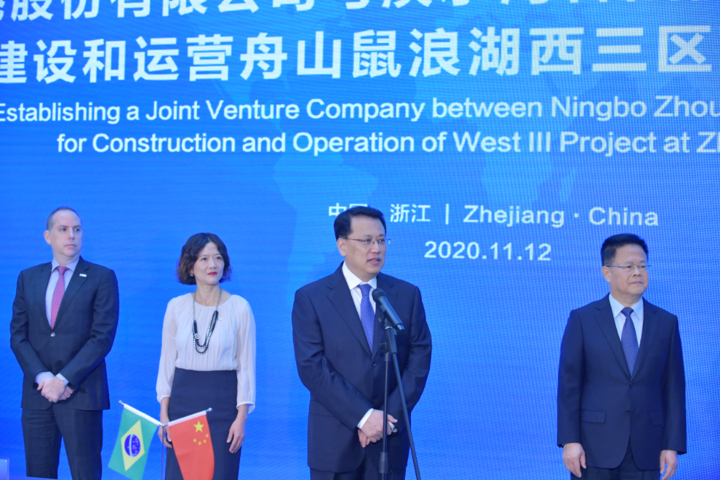 11月12日上午,宁波舟山港股份有限公司与淡水河谷国际有限公司组建合资公司建设和运营舟山鼠浪湖西三区项目签约仪式在杭州举行。省委书记袁家军、省长郑栅洁以视频连线的方式,与巴西淡水河谷公司首席执行官柏安铎一同见证。