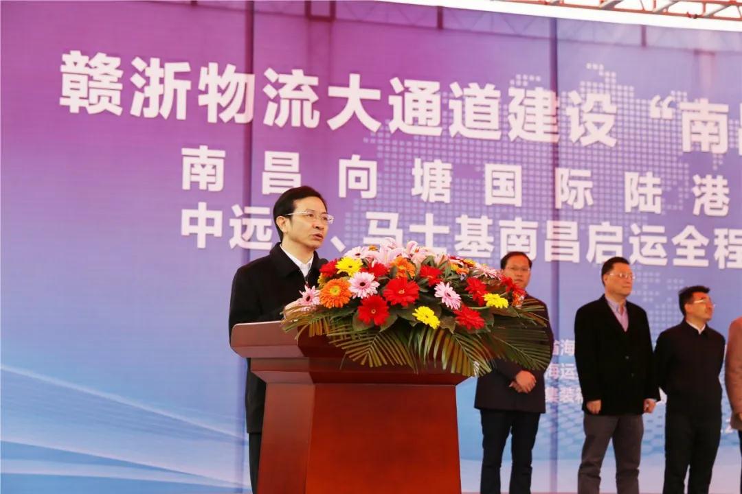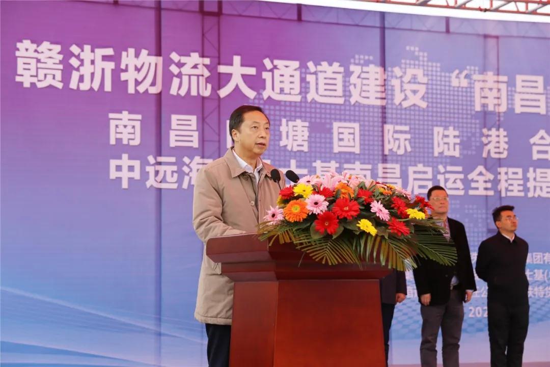 黄喜忠在活动上致辞,他表示南昌向塘国际陆港与宁波舟山港股份有限公司合作签约以及江西省首列中远海、马士基全程提单专列发运,是浙赣两地深度融入共建“一带一路”、加快陆海联动发展、携手构建新发展格局的重大举措。南昌市正乘着党的十九届五中全会的东风,聚焦构建新发展格局重大战略部署,围绕打造国际一流物流枢纽战略定位,加快推进南昌向塘国际陆港新城建设,通过实施腹地市场延伸的国际化战略、资本资源集聚的平台化战略、产业链提能的生态圈战略,奋力打造“国家陆路开放实验示范区”“江西‘三同’实验发展创新区”和“大南昌都市圈铁路物流集聚区”。