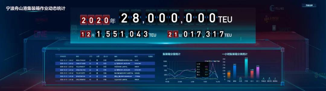 12月21日凌晨,随着宁波舟山港调度指挥中心大屏幕上的集装箱实时生产数据跳过“28,000,000标准箱”,宁波舟山港年集装箱吞吐量首次突破2800万标准箱,再创新高。