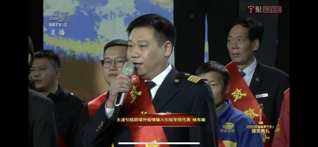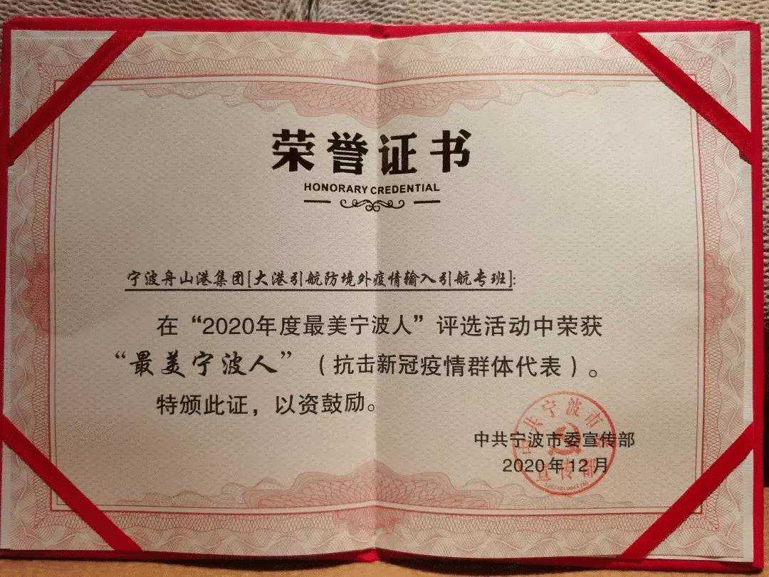 12月22日,大港引航派代表参加2020年度“最美宁波人”颁奖典礼。典礼上,宁波大港引航有限公司防境外疫情输入引航专班被授予2020年度“最美宁波人”荣誉称号。
