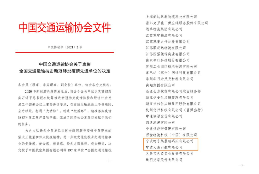 1月19日,从中国交通运输协会传来喜讯,集团所属宁波梅东集装箱码头有限公司、宁波大港引航有限公司被授予“全国交通运输抗击新冠肺炎疫情先进单位”称号。