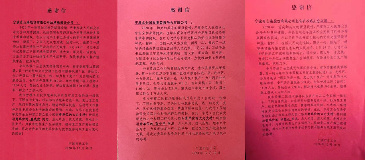 1月20日,股份公司所属宁波甬港拖轮有限公司职工虞成安、宁波北仑第一集装箱码头有限公司职工张中华,以及宁波舟山港股份有限公司北仑矿石码头分公司职工华林江先后收到宁波市总工会的《感谢信》,感谢他们在2020年疫情期间为宁波市恢复生活秩序、助力复工复产做出的积极贡献。
