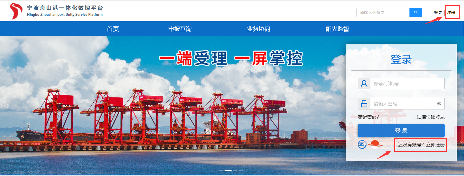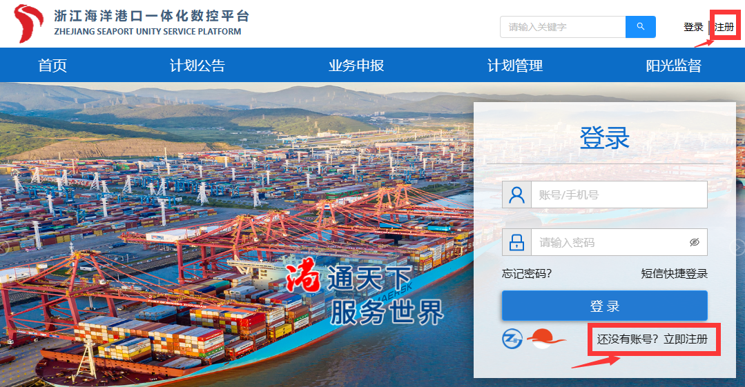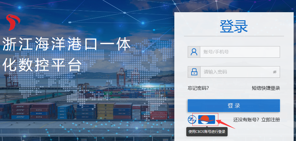 浙江海洋港口一体化数控平台,可与CBOS和江海联运双平台进行数据联通,新用户在本平台上注册账号后,可以绑定原有的CBOS或江海联运平台账号,即可以实现CBOS或江海联运账号直接登录的效果。