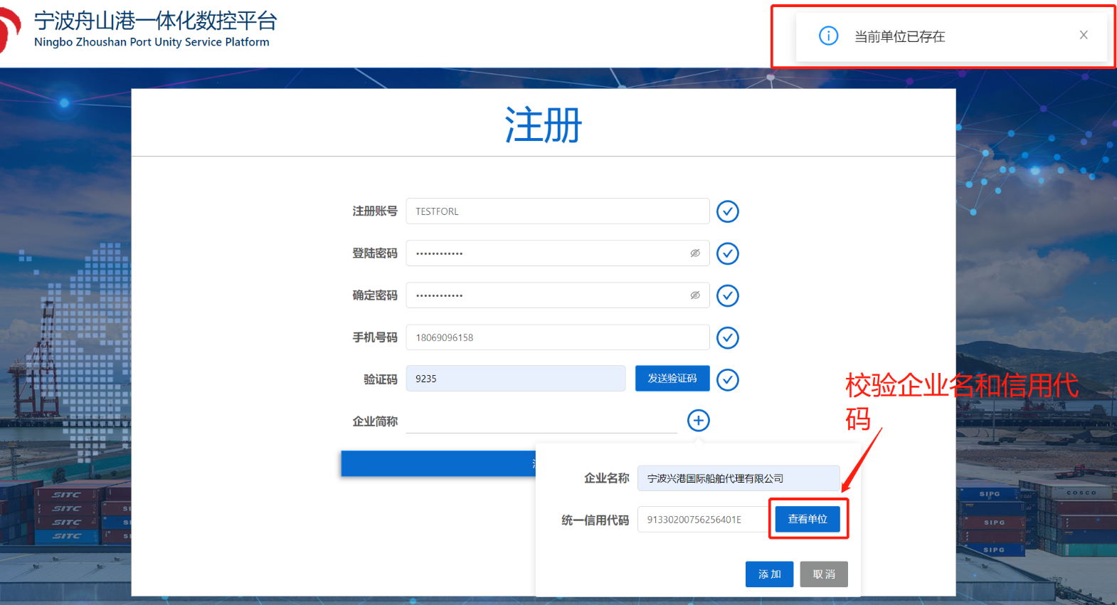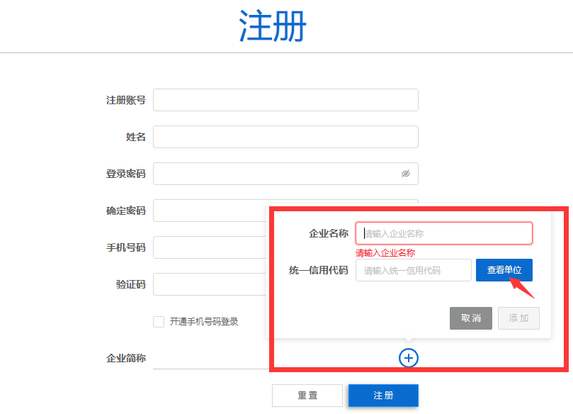 3.企业简称,点击右侧的【+】,弹出框中输入企业名称和社会统一信用代码后,点击【查看单位】,系统将会校验企业是否存在系统内,系统存在则可以添加,如下图所示。