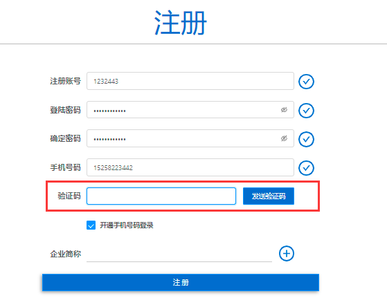 2.在注册页面依次填入账号、登录密码、确定密码、手机号码,点击【发送验证码】后获取并填写验证码,如下图所示。