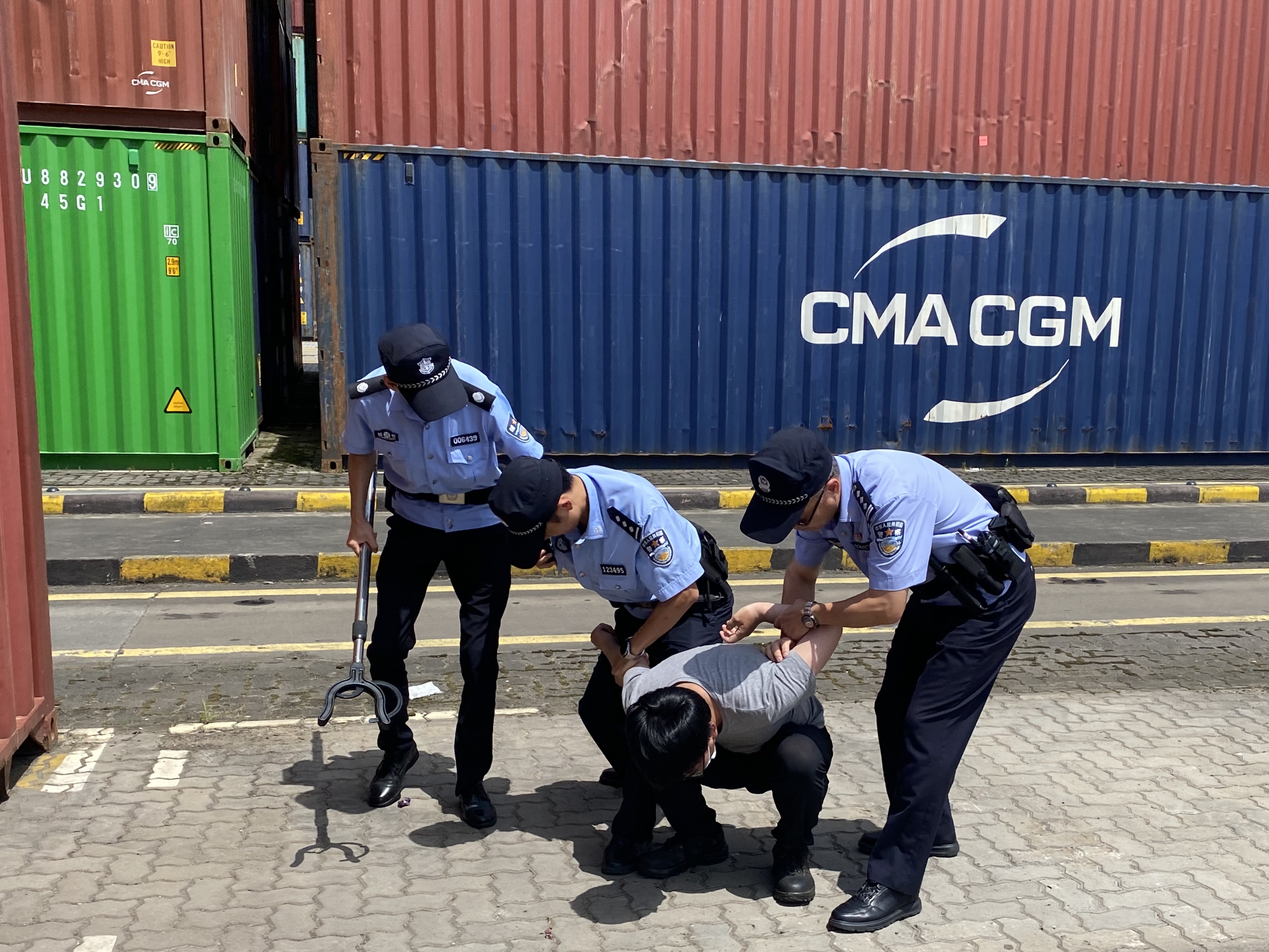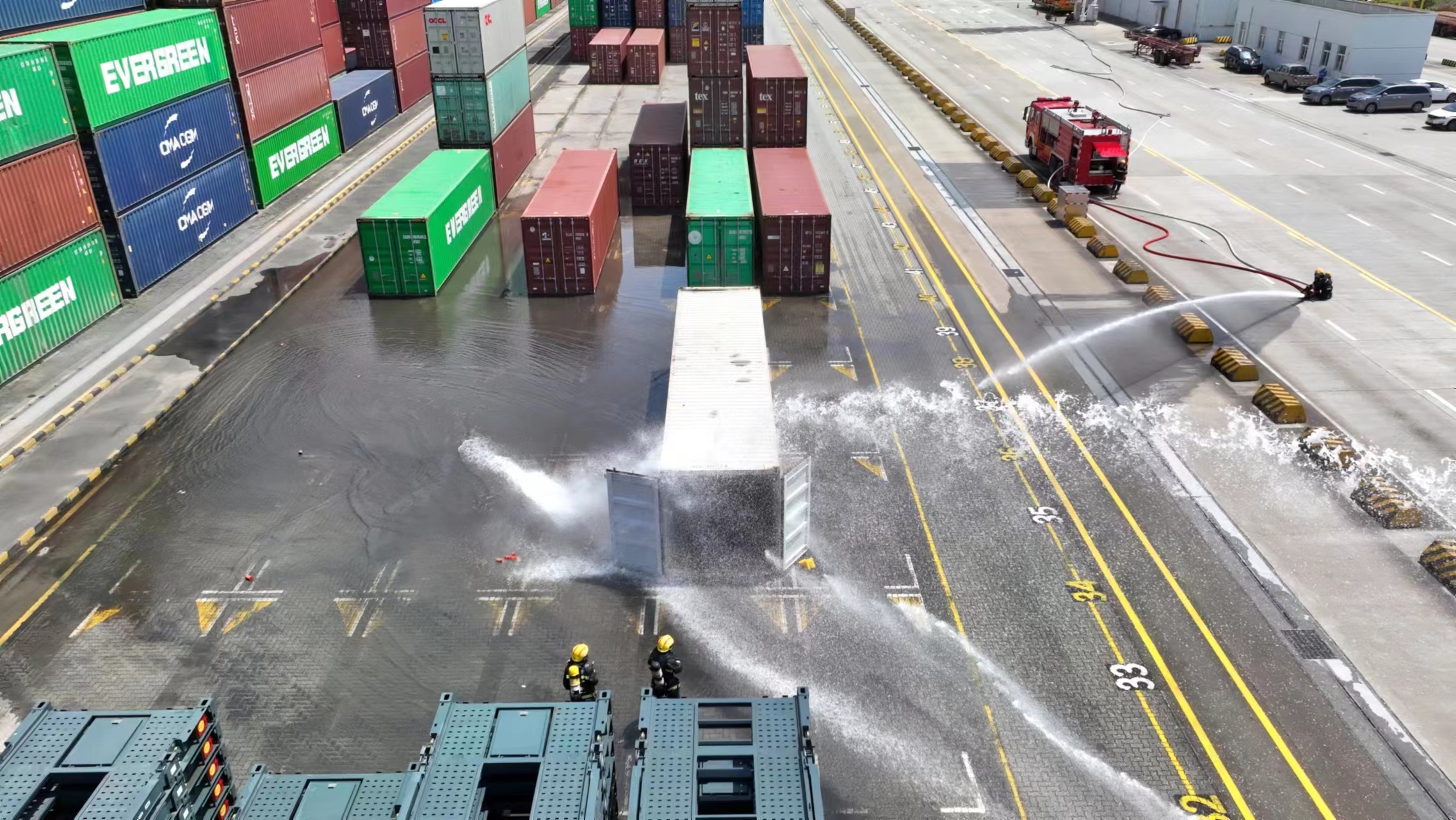 港公安及港消防火速赶到事发现场。在港公安堵截并逮捕可疑人员后,现场消防指战员立即铺设消防水带,三辆消防车同时对着火的锂电池集装箱及其周边集装箱进行喷水降温。待温度降到一定程度后,操作部门安排龙门吊和集卡将事故箱周围集装箱吊离场地,紧接着,消防员持续对事故箱进行喷水降温,阻止该箱温度升高,并最终将起火集装箱的明火扑灭。