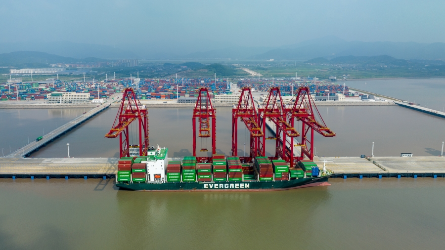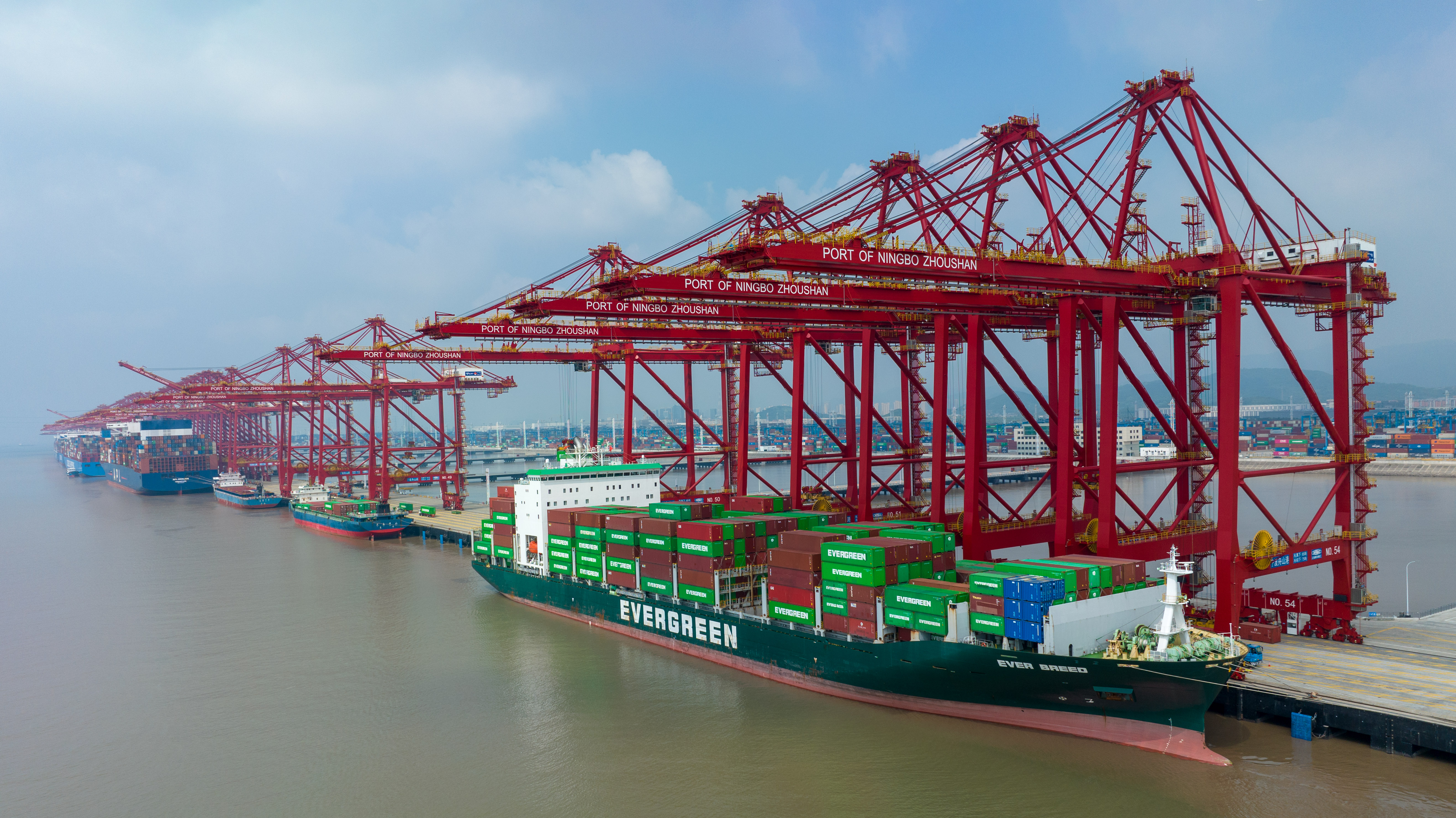 8月14日13时15分,长荣海运旗下东南亚航线的集装箱船舶“长育”轮在完成装卸作业后,缓缓驶离宁波舟山港梅山港区集装箱码头9号泊位。这是该泊位获批临时对外启用后完成的首次国际航行船舶作业,为梅山港区建设千万箱级单体集装箱码头进一步夯实基础。