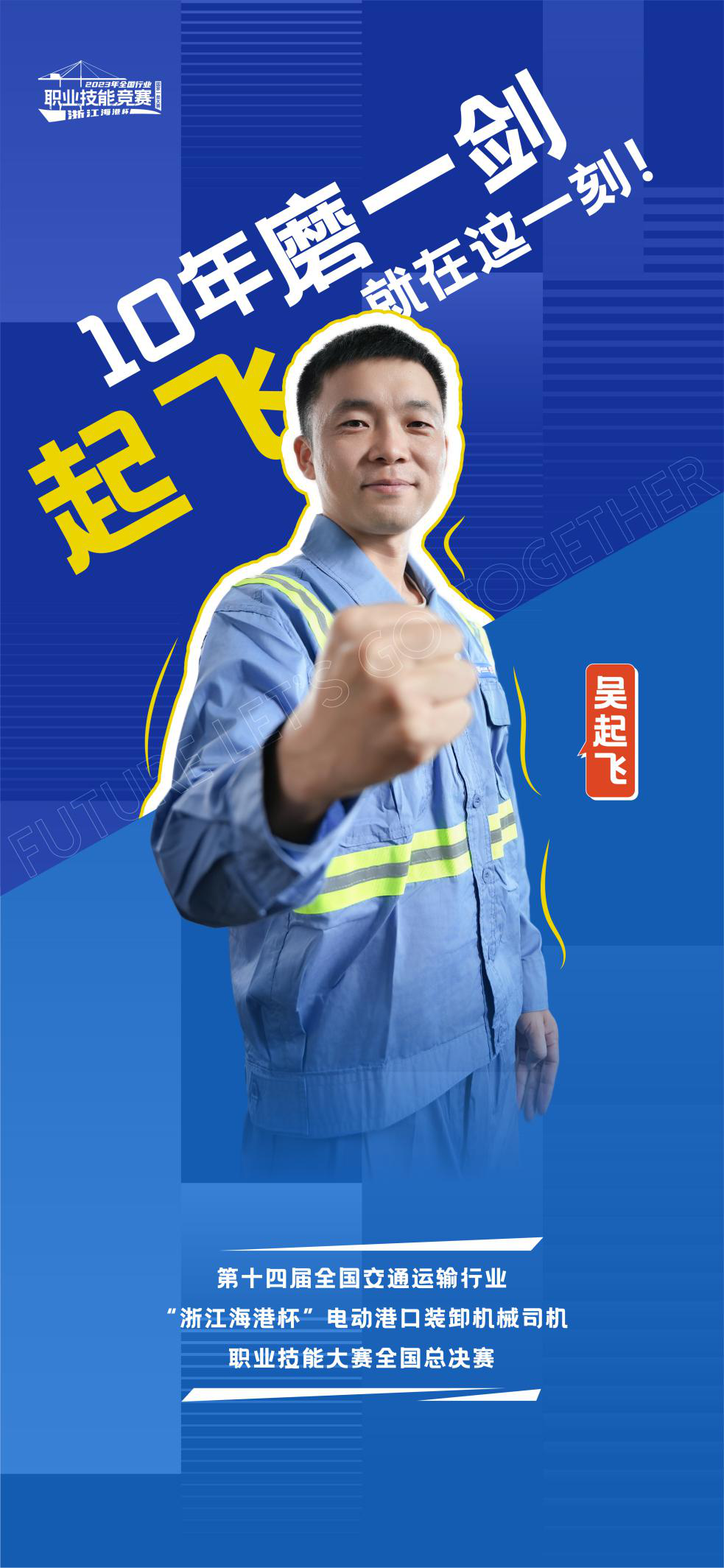吴起飞,来自丽水的一个普通家庭,父母的艰辛和勤劳让他早早懂事,使他拥有了自信、自立、自强的优秀品质。2011年,大专毕业的他,带着父母的殷切希望,抱着对未来的憧憬与期待,来到宁波舟山港,成为了一名桥吊司机。十年磨一剑,铺就了吴起飞的全国冠军之路。