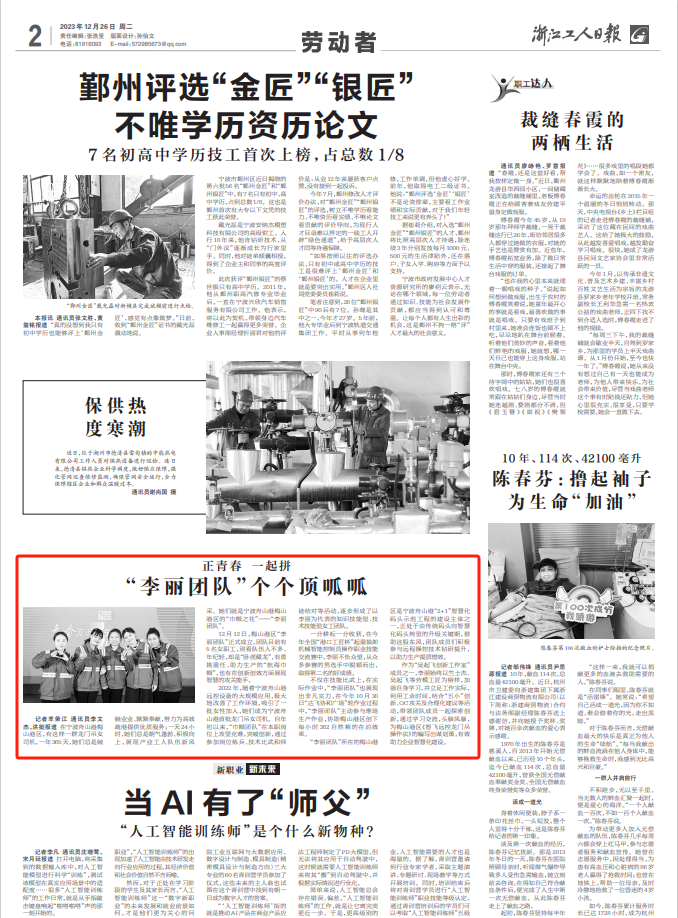 12月26日,《浙江工人日报》“劳动者”版面刊发文章《正青春 一起拼 “李丽团队”个个顶呱呱》,特别报道在宁波舟山港梅山港区,有这样一群英勇奋进的女性,她们投身于生产一线,坚守岗位,为港口的繁荣作出了贡献。