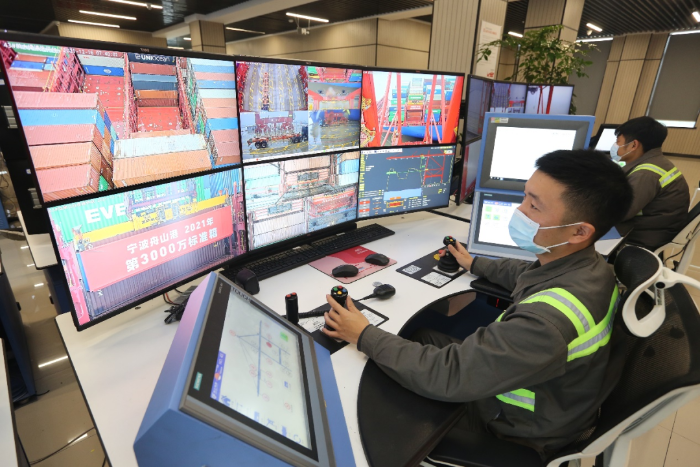 2021年,宁波舟山港年集装箱吞吐量首破三千万标准箱起吊仪式在公司举行,吴起飞在距离码头4公里以外的远控桥吊操作室内,操作手柄平稳地起吊了第三千万个标准箱。