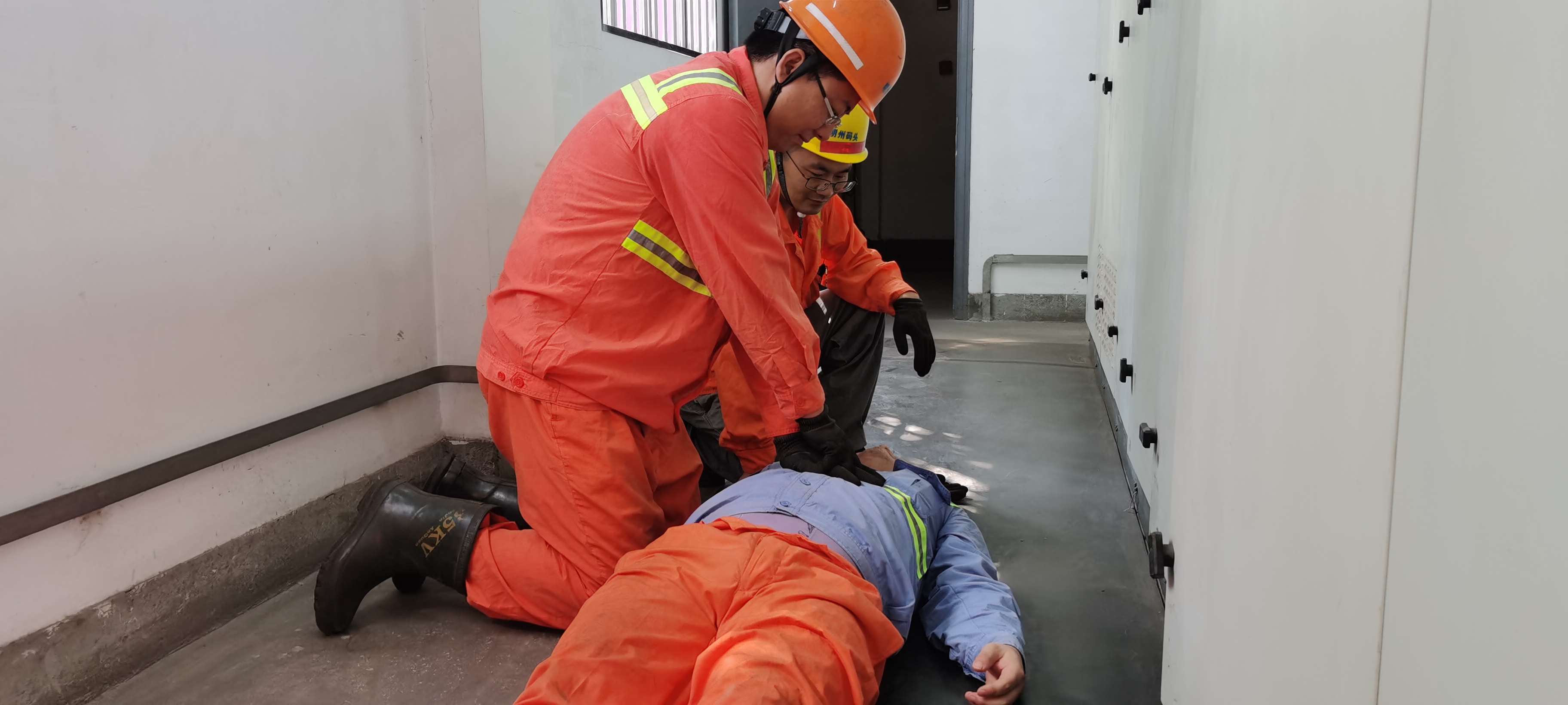 电工班常年与电打交道,触电事故的防范与救援是班组成员的必备技能。此次演练模拟检修人员在0#变电站不慎被电击倒,全体参练人员通力配合,按照触电急救“迅速、就地、正确、坚持”的方针快速处置。指挥调度人员临危不乱,及时上报险情,科学下达执行指令;施救人员正确穿戴绝缘护具,避免发生二次伤害,并立即采取心肺复苏和人工呼吸等急救措施,达到演练预期效果。