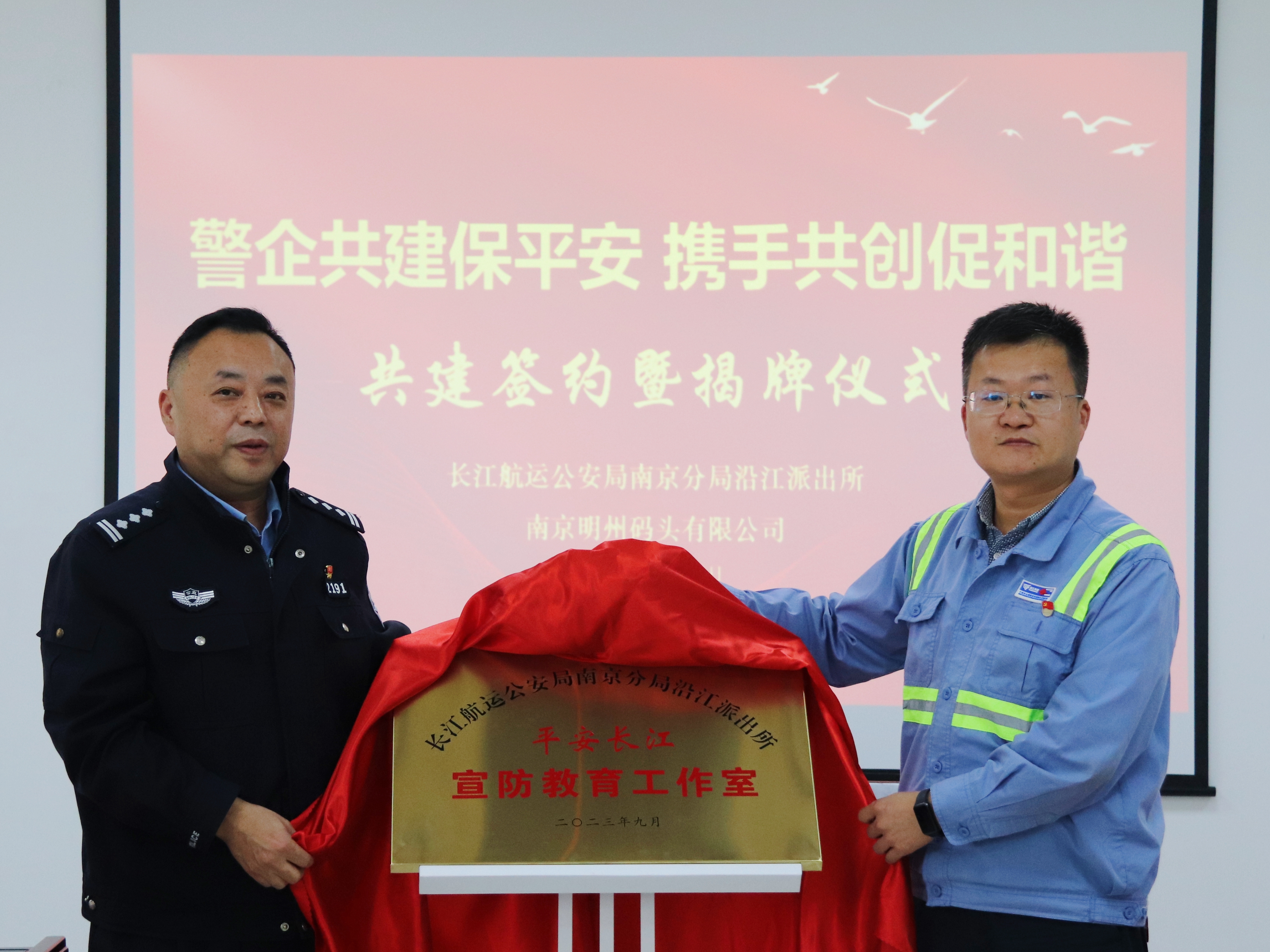 沿江派出所党支部书记、所长郭跃、公司党委副书记、总经理陈进分别代表双方签订《警企共建协议书》,并为“平安长江宣防教育工作室”揭牌。