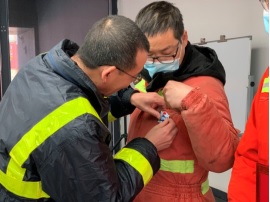 会议在总结2020年度经验,制定2021年度计划的同时,还表彰了过去一年中荣登各个“段位”的优秀青年。图为工程技术部党支部书记徐俊向荣获“最强王者”的五名队员授予突击队定制徽章。