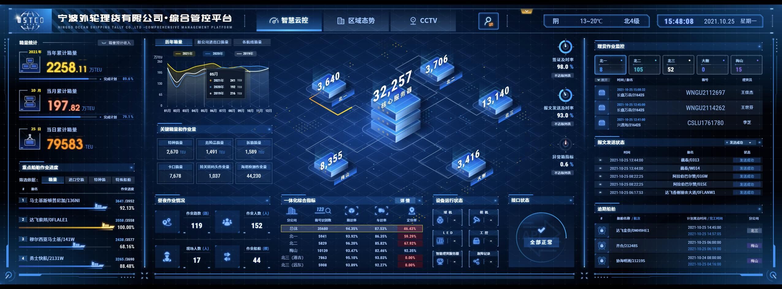 此前,因外轮理货作业形式多样、点多面广,宁波外理存在现场综合管控难度较大、系统设备故障显示滞后、数据分析处理不直观等问题。针对这一情况,该公司于今年2月启动智能化调度综合管控平台研发工作,组织研发团队陆续完成智慧云控、区域态势、CCTV监控等页面展示内容的搭建及数据的整合对接,并于9月进入平台试运行阶段。