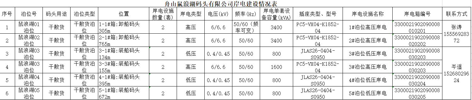 舟山鼠浪湖码头有限公司5个泊位共安装12套岸电设施,实现港区岸电全覆盖,信息如下: