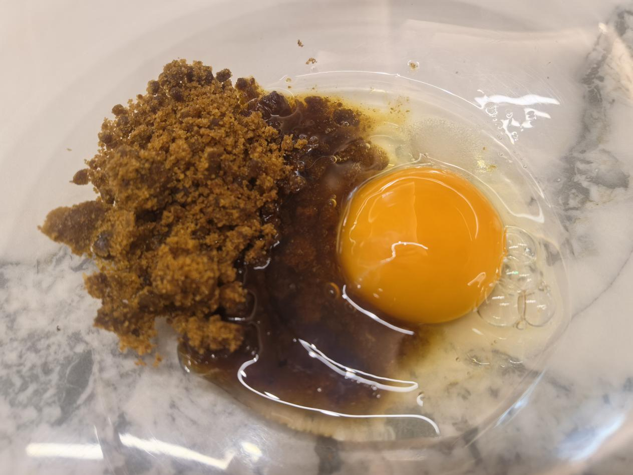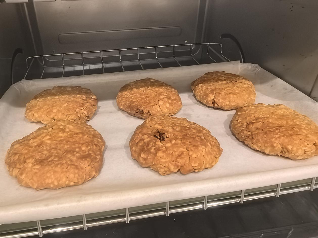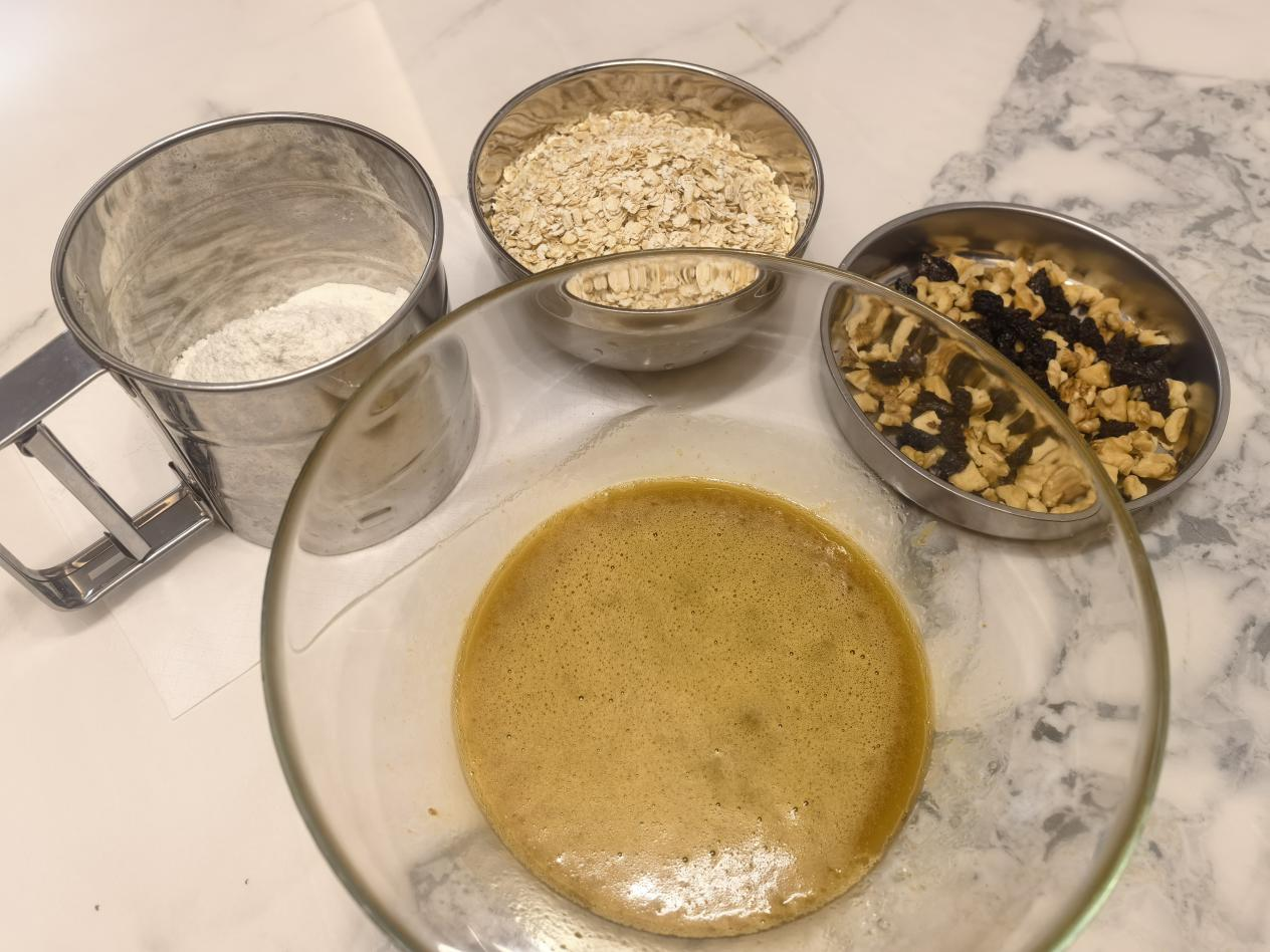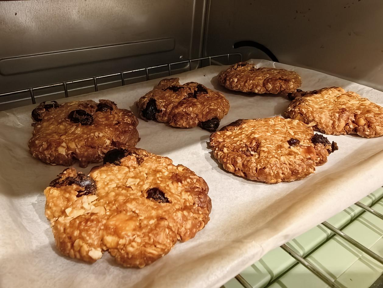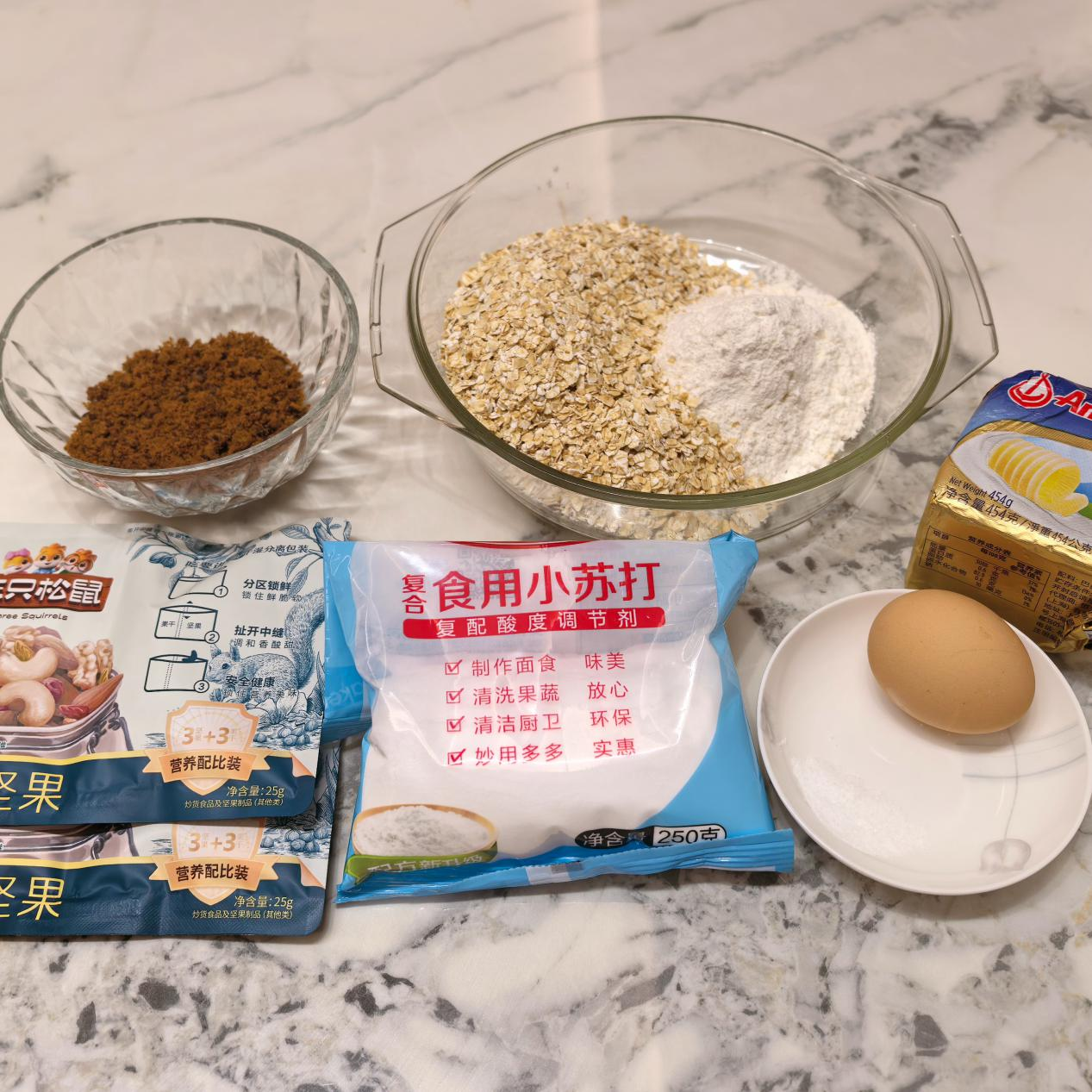 鸡蛋1个、黄砂糖/红糖45克、黄油90克(提前微波炉加热融化)、坚果/果干50克、低筋面粉80克、即食燕麦片105克、小苏打1克、盐1克