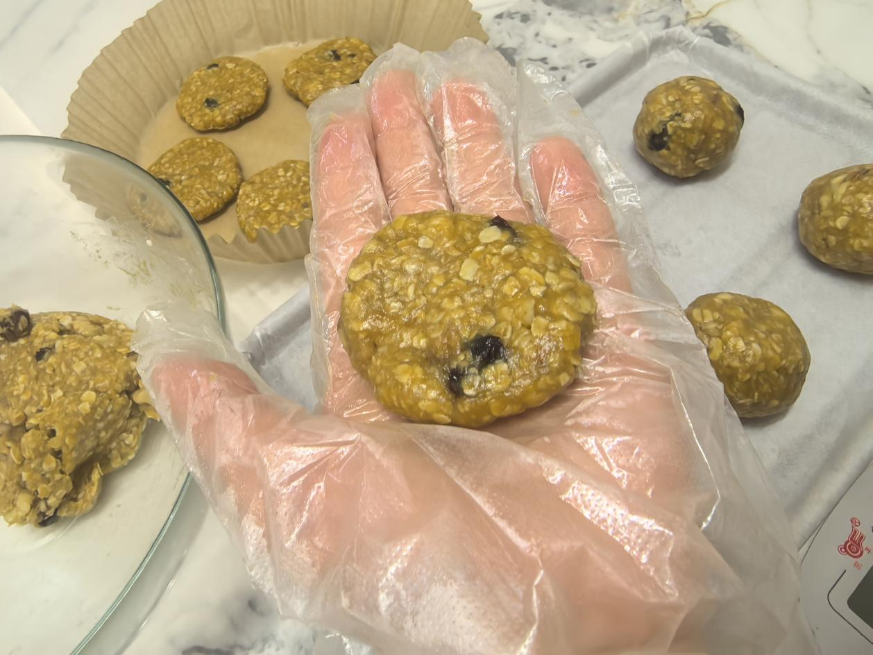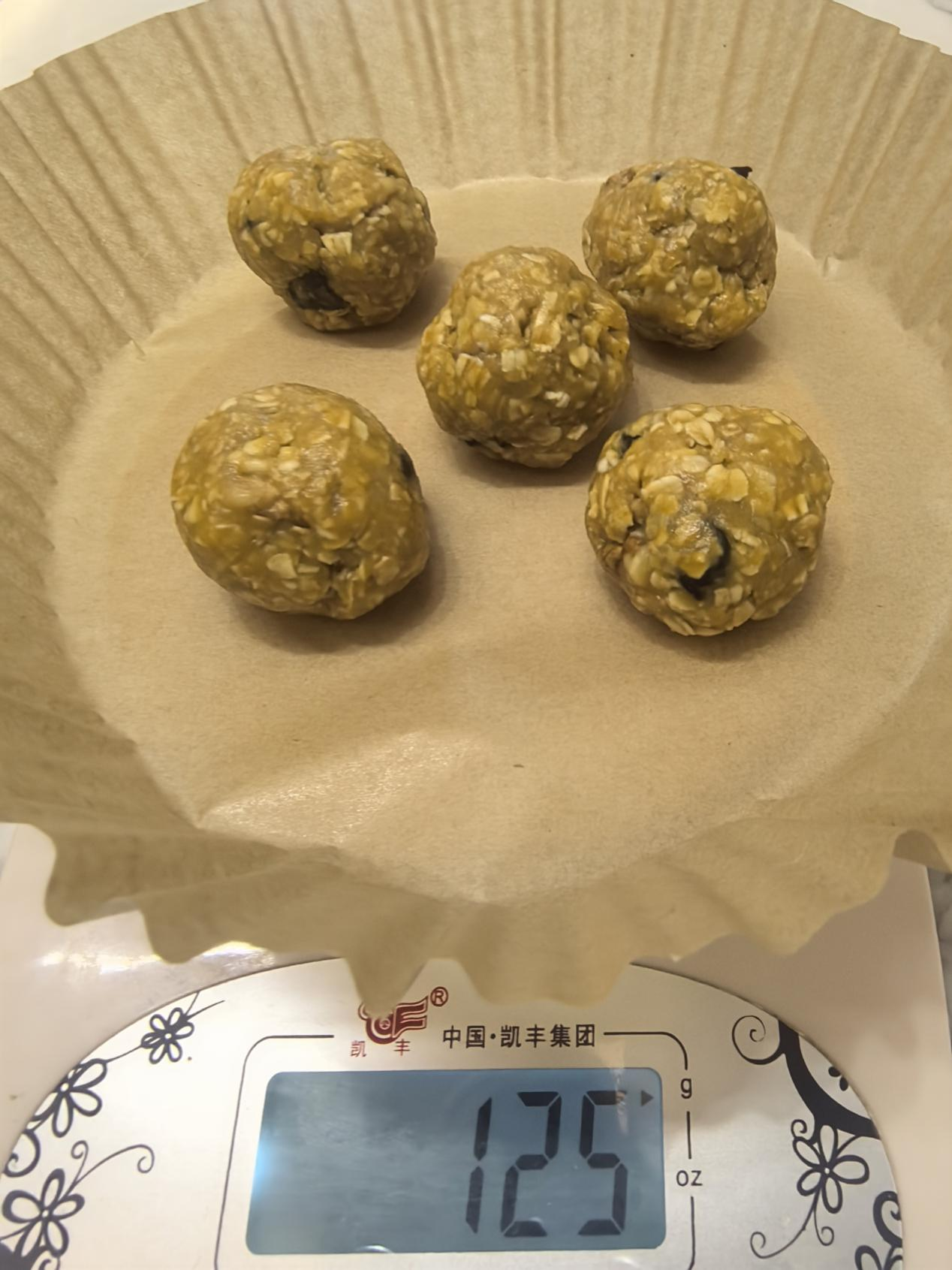 2. 造型自由:烤盘垫油纸,取一小团燕麦糊(约20-25克)搓圆压扁。(燕麦糊需放冰箱冷藏一小时,塑型前后均可)