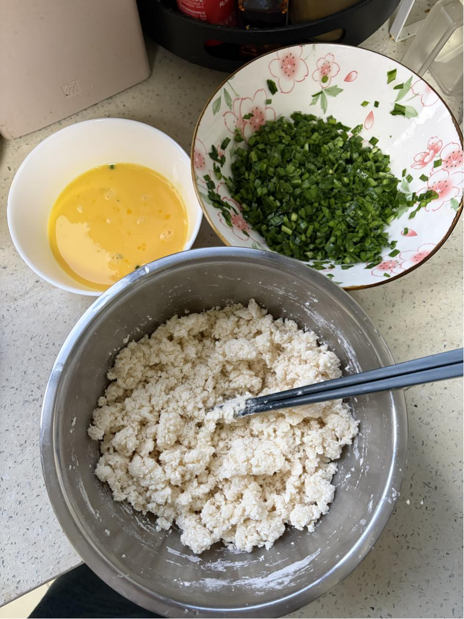 馅料:韭菜300克,鸡蛋3个,盐、胡椒粉、食用油适量(调馅使用)