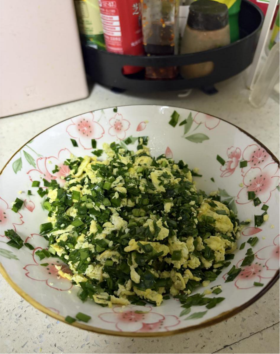 韭菜洗净沥干切碎,立即倒入食用油拌匀,让油锁住切口(不出水的关键),鸡蛋炒碎放凉,与韭菜拌匀。