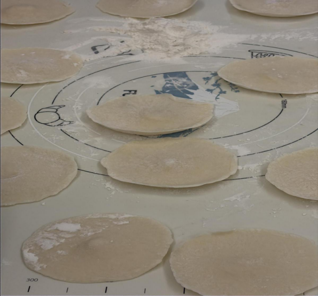 醒好的面团搓成长条,切成均匀的面团,擀成面皮,放入馅料,边角捏紧。