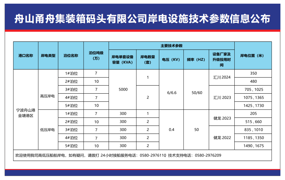 根据《港口和船舶岸电管理办法》(交通运输部令2019年45号)的要求和《宁波舟山港股份有限公司船舶岸电管理办法(试行)的通知》进一步推进船舶靠港使用岸电工作的通知精神,其中具备受电设施的船舶(液货船除外),在我司沿海港口具备岸电供应能力的泊位靠泊超过3小时,且未使用有效替代措施的,应当使用岸电。我司码头现已完成3套高压岸电和9套低压岸电设施的建设并已通过专业机构供电检测。其中高压岸电单套设备容量5MVA,具备向大型船舶提供6.6kV 60Hz或6kV 50Hz的供电能力;低压岸电单套设备容量300kVA,具备向小型船舶提供400V 50Hz的供电能力,现予公示。