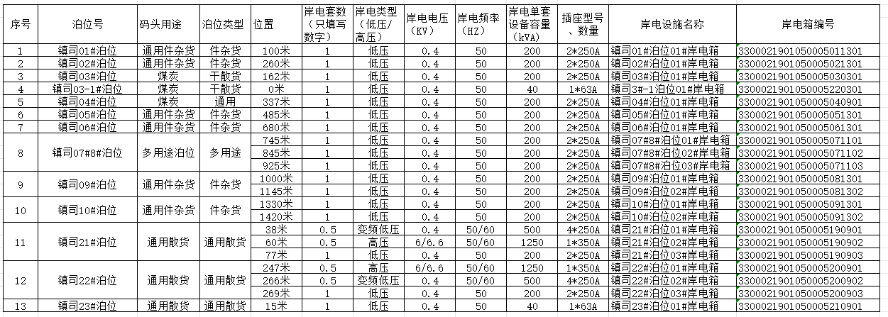 镇司13个非化工区泊位共安装19套岸电设施,实现港区岸电全覆盖,信息如下: